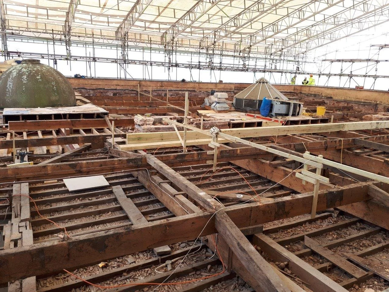 In 2016, PCA and Purcell Architects were appointed to design a new lead covered flat roof structure to replace the existing arrangement. The new roof structure incorporated the original primary beams and truss ties, repaired and strengthened as required, with new secondary timbers and roof joists laid to suit the revised gutter arrangements. These were boarded with softwood boards and penny gaps in the traditional fashion, prior to covering with lead.